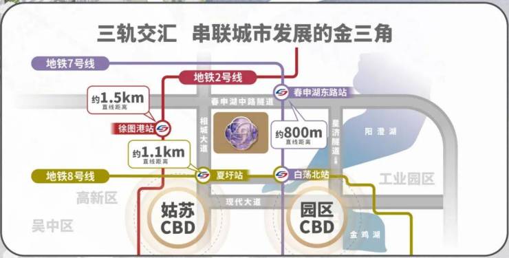 自驾路网:春申湖快速路、中环北线环绕,通过相城大道可直达园区湖西CBD和姑苏区