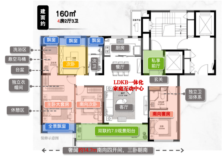 160㎡四房两厅三卫:4开间朝南,客厅方厅设计,开间4.9米,阳台双开间7.9米,主卧开间3.6米