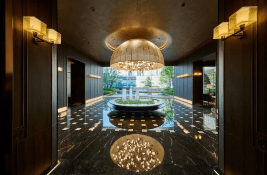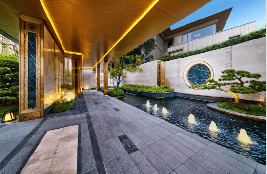 双园围合:项目内部打造“内外双园”景观体系,禅意水系、琉璃屏风、龙鳞吊顶,东方美学与现代奢居交融。