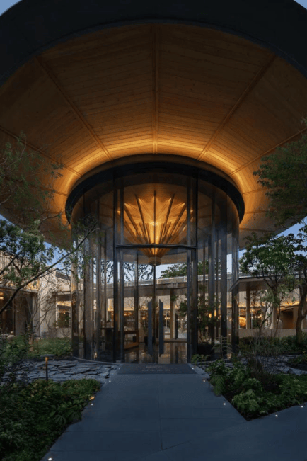 隐秀会所下沉式设计,玻璃幕墙通透采光,270°观景视野全龄社交空间全天候开放