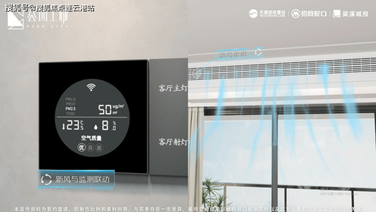 在公园上城,户外设置气象监测站,时时监测社区空气质量各类指标;室内设置空气质量检测与展示系统,检测室内二氧化碳、PM2.5等指标,显示在家中的智能面板上,让每一次的空气变化都可明察。