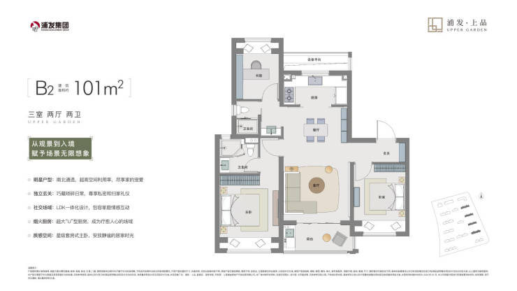 101㎡三房:南向三开间设计,主卧套房带独立卫浴,客卫干湿分离,U型厨房设计