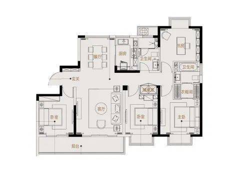 116平:三房两厅两卫,和98平相比,每个功能区的空间都要大一些。除了贯通阳台的卧室,南向主卧和北向次卧都做了飘窗,空间性价比略高于98平。