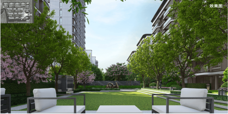 “一心两轴六境”景观系统,融合中央水景、阳光草坪、健身环道、睦邻会客厅。