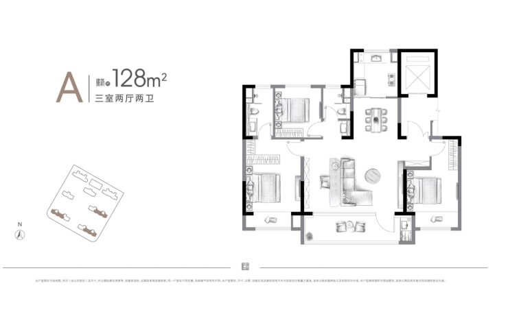 128㎡ 18,700–19,500元/㎡ 240万–250万元 3室2厅2卫,双卫设计,空间更舒展,适合三代同堂