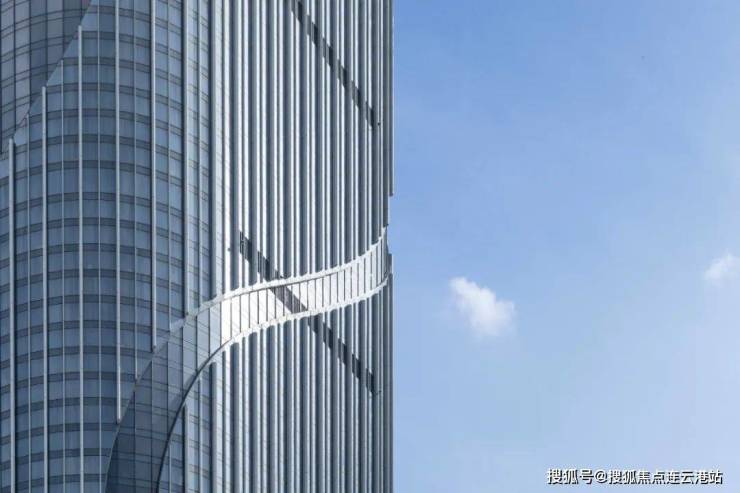 配套副楼作为商业及社区服务场所,横向的表皮处理仿佛是延绵起伏的江面,为市民提供了一个宜人通透的界面。屋顶平台的线条进一步向外延伸,将建筑与景观融为一体。具有艺术性的雨篷衔接双塔底层,为市民创造一个良好的步行体验。