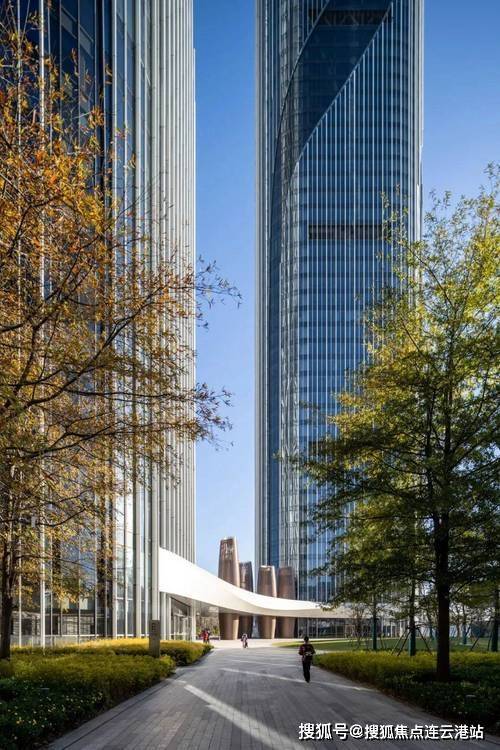 项目邀请国际知名大师团队EID ARCH首席建筑师姜平,通过双子超塔的建筑形象将智慧之门以抽象化的形式呈现出来。作为地块南侧城市轴线的终端, 双子塔的门户形象回应基地周边的城市空间关系,与整体的城市设计相协调。