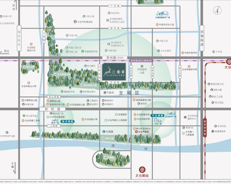 周边环绕 太仓湿地公园、净水公园、乐琯运河生态带 ,形成“两河三园一带”城市绿肺