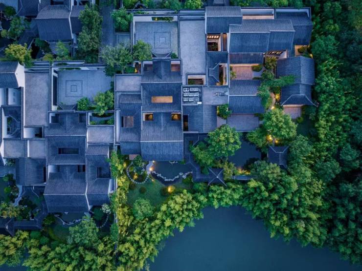 复刻明清“四水归堂”形制,白墙黛瓦木纹格栅立面