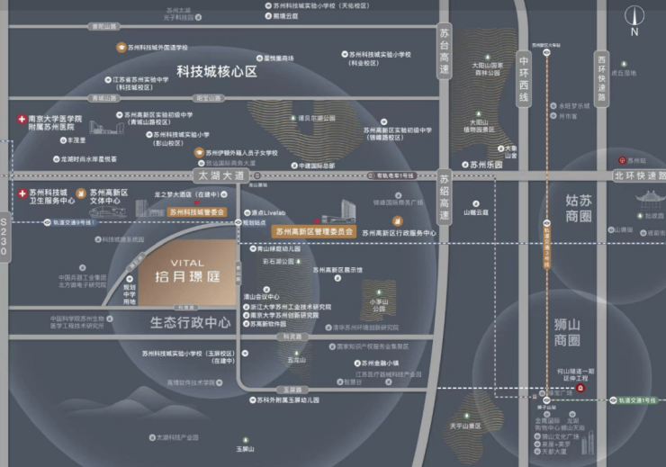 产业支撑:周边集聚了中科院苏州医工所、苏高新软件园、阿里巴巴等高新产业与大院大所,形成了高知、高净值的纯粹邻里圈层。