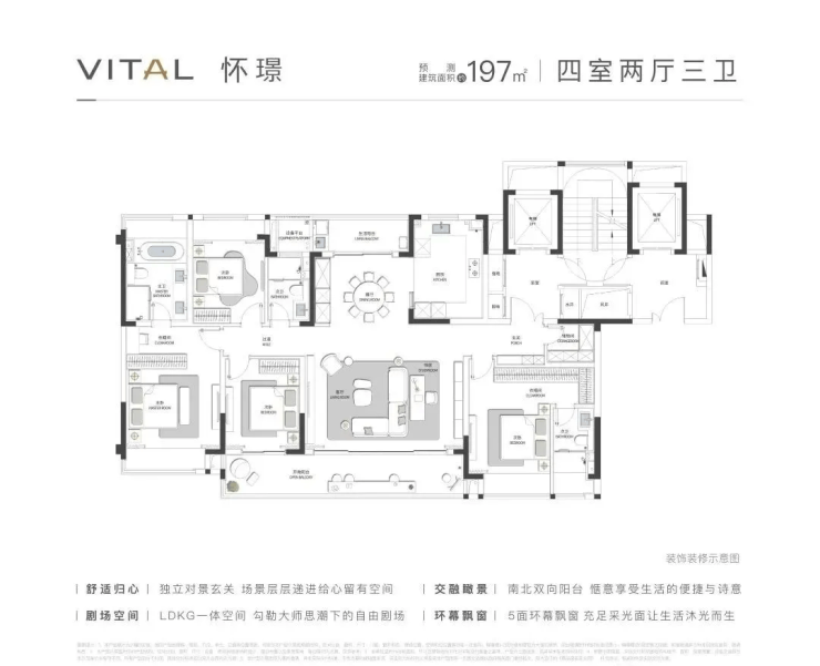户型设计:社区共 639 户,主力户型为建面约170㎡、197㎡、230㎡的四房大平层,起步面积大,圈层纯粹。户型设计强调大面宽与短进深,如 170㎡户型拥有约 6.6 米大宽厅和约 9.8 米双联阳台,230㎡户型更是定义了塔尖生活的空间尺度。