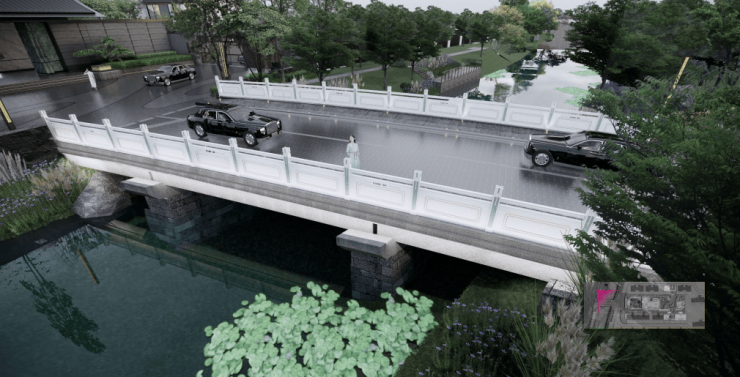 穿过营销中心,即可来到内院空间——「拂水晴岩」,由石桥、凉亭、雨林、假山,鱼池,花间小道六大景观组成。