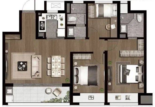 项目主打户型,南向3.5面宽, 在105㎡面积段做南向餐客横厅并连通景观阳台,是该户型加分项。公卫三段式卫浴设计,干湿分离;双卧朝南带飘窗,主卧套房;