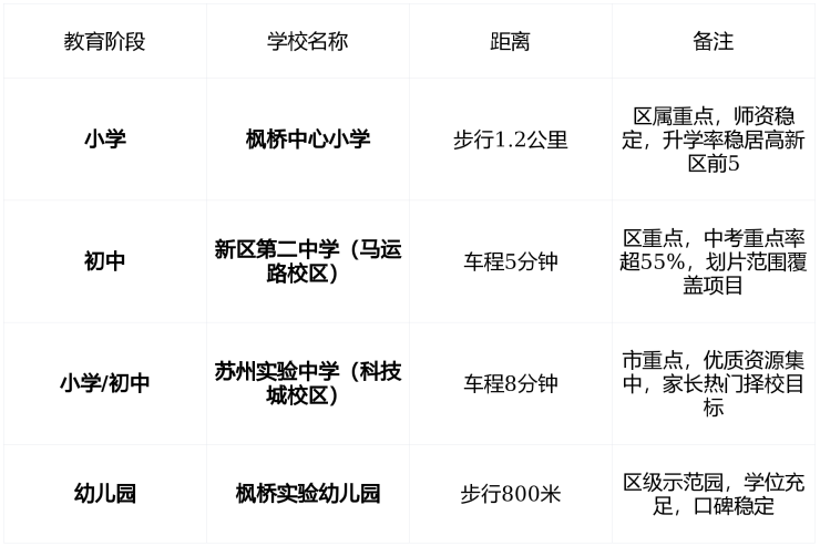 项目 未明确划入公办小学学区 ,但 紧邻枫桥中心小学、新区二中 ,属 高新区核心教育辐射圈 ,家长普遍选择“公办+优质民办”组合路径。