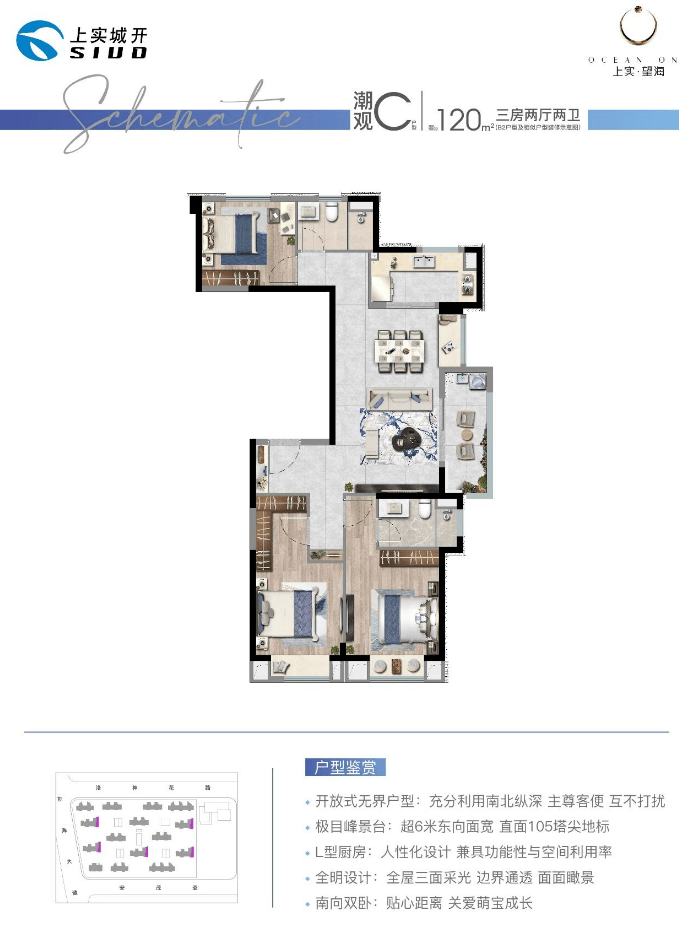 约120㎡三房:四开间朝南,横向客餐厅+超大阳台,主卧套房设计,南北通透,得房率达76%-80%,适合改善型家庭,总价约417.5万