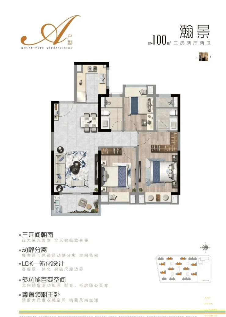 目前主推建面约100㎡、120㎡、122㎡的三房两厅两卫户型,满足从二人世界到二胎家庭的全生命周期居住需求: