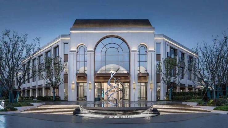 湖语颂承袭法国古典建筑精髓,立面采用局部石材、真石漆、保温一体板及LOW-E中空玻璃,米白色主调搭配灰色坡屋顶,营造出典雅高贵的法式气质。项目限高8层24米,通过三面环水、北高南低的人性化设计,复刻法式宫廷的对称布局。