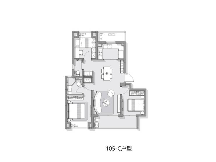 约105㎡三房两厅两卫:U型厨房设计,动线合理,收纳空间充足