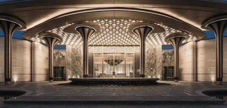 项目恢弘大气的门头,项目设计师以浮岛为灵感,将几根立柱化作悬浮的雕塑,撑起一片轻盈的仪式感。