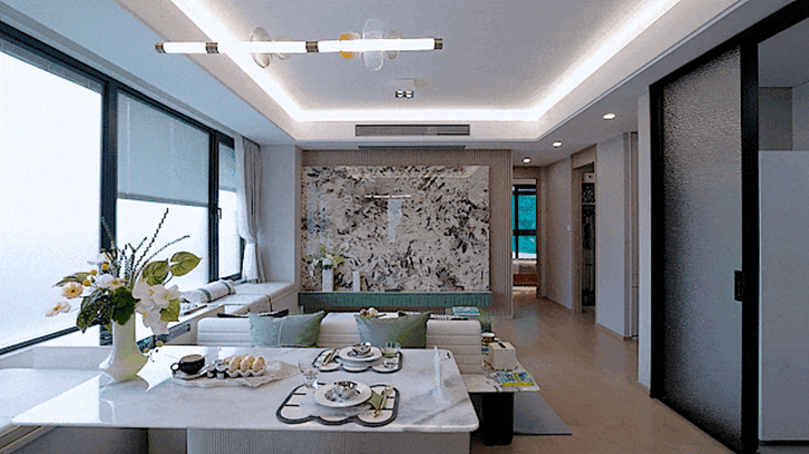 LDKB的一体化布局,串联起客厅、餐客、厨房、阳台四个空间,缩小过道占用,整体提升空间利用率与室内的通透度。同时,L型厨房连接岛台布局,营造出舒适、开放的空间,进而提升业主居家生活的沟通和舒适度,极大营造改善居住大家的高级感、层次感。