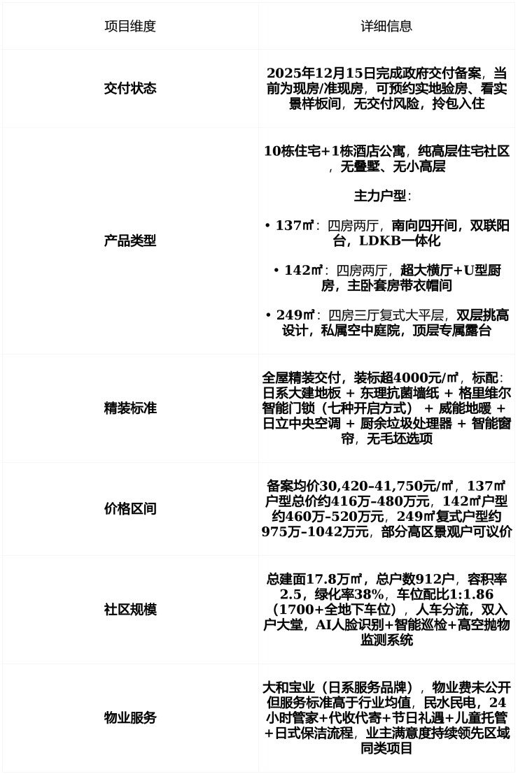 在售状态2026年1月仍余少量尾盘在售主力产品为137–249㎡精装大平层备案均价30,420–41,750元/㎡,总价区间416万–1042万元2025年12月已通过交付备案,现为现房/准现房可实地验房、即买即住