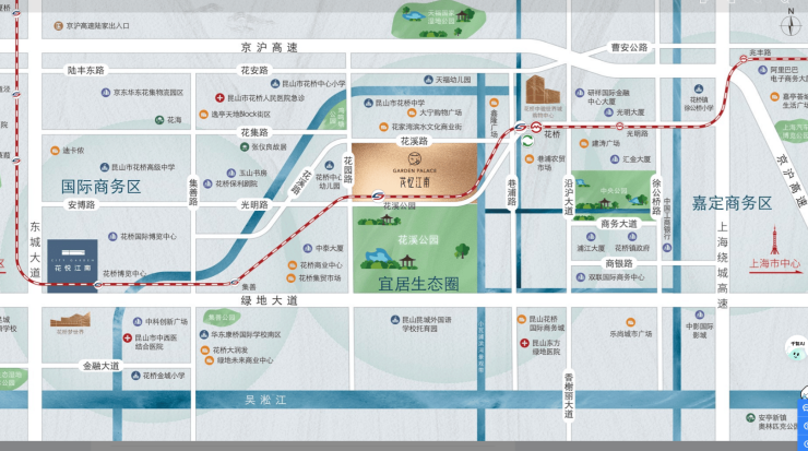 距沪苏通铁路花桥站约2.5公里,10分钟车程,可直达上海站、苏州站