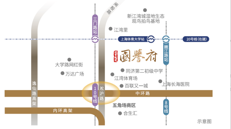 1公里内接入内环高架、中环、逸仙高架,10分钟到陆家嘴,15分钟到徐家汇,20分钟到前滩;