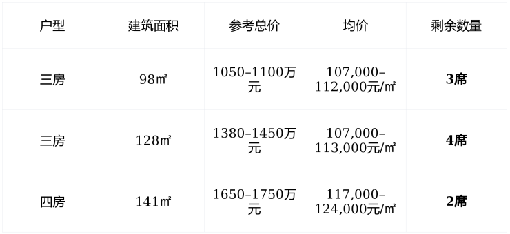剩余房源 : 总计不足10席 , 141㎡大四房仅剩2套 , 为2026年最后批次 , “买一套少一套”已成定局 ;