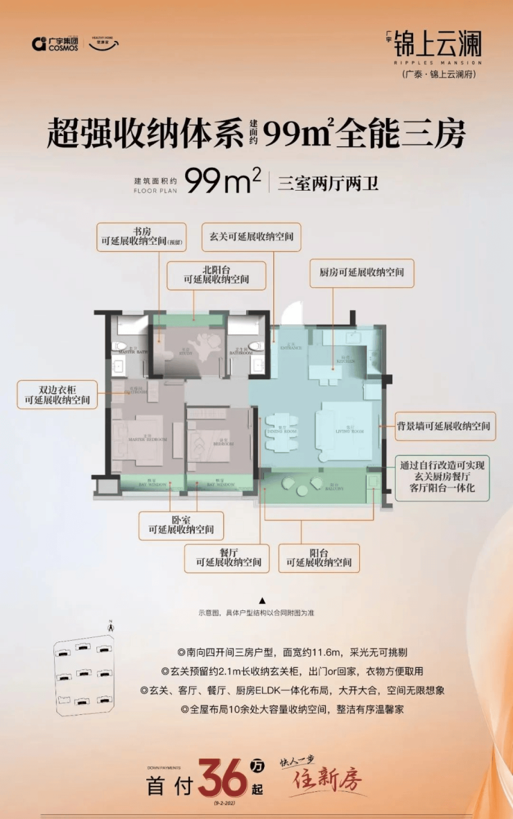 户型设计:主力户型实现四开间朝南,南向面宽达11.6米,辅以南北双阳台,空间利用率高。