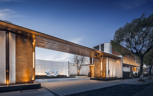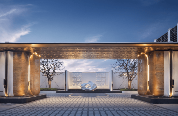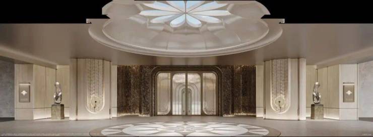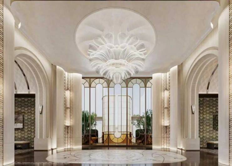 闵行第一个约4米高墙、约350米城市华墙勾勒社区恢弘界面,约70米星级大门以贝金米黄石材、玉兰花雕塑点睛,透光云石悬于门厅,勾勒出媲美半岛酒店的归家门面。