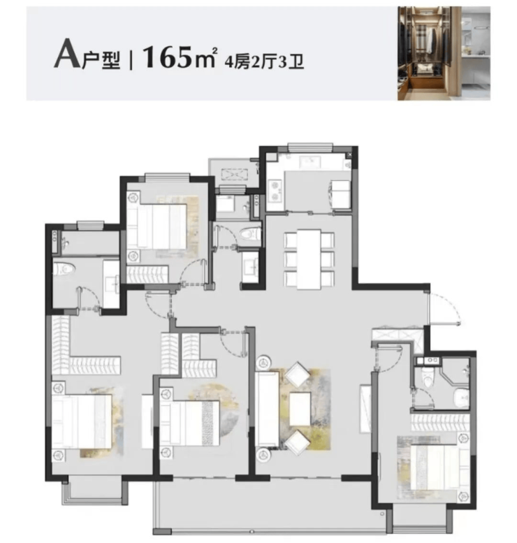 165㎡ 四居室:总价约320万起,南北通透,三卫设计,为热销主力户型