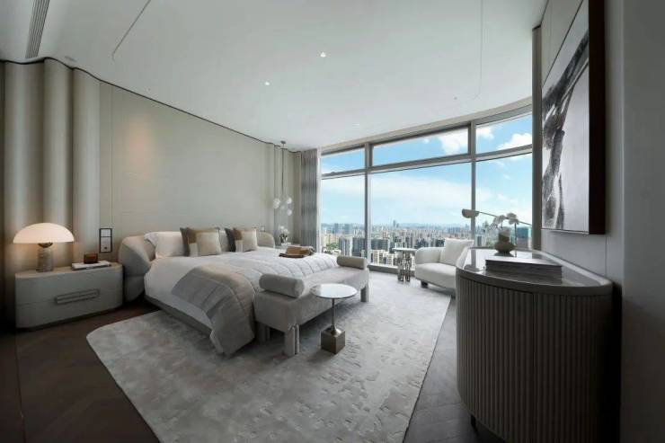 大尺度空间的高效利用,让EIC大平层带来更多超越以往的空间享受。南向三个套房,开间24米,足以停下4辆加长林肯。走进主卧,罕见的主卫双开门设计,面积比一般人的主卧还要大,鱼肚白材质通顶,劳芬捷仕品牌产品满配,甚至连公卫都配备劳芬智能马桶,在这里泡澡无需担心隐私问题。