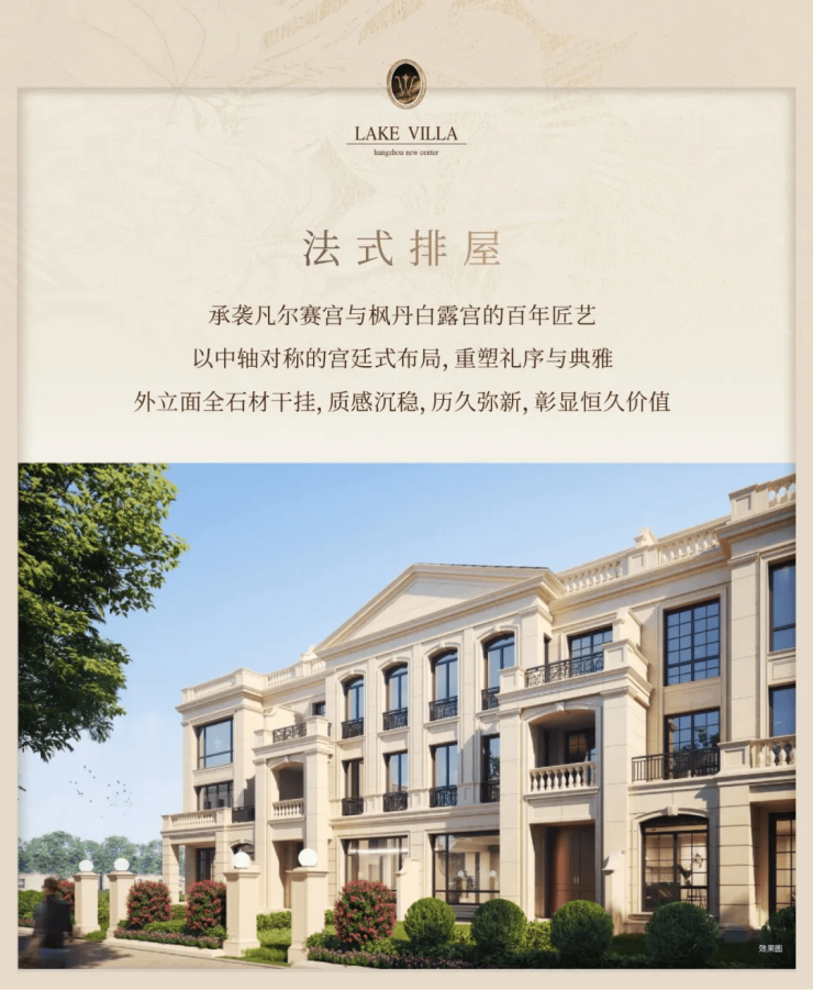 法式排屋:建面约437-483平方米,奢阔尺度杭州罕见,配备前庭后院、顶层大露台、全套房设计及全明挑高地下室(层高6.4米),总价约2000万起。