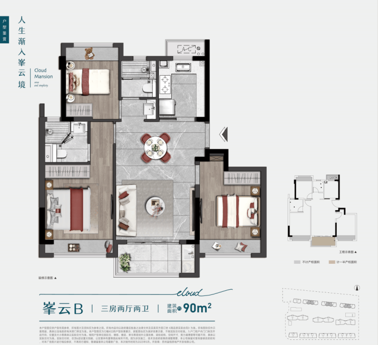 90㎡3室2厅2卫6-10层/1梯2户精装(含三大件)小三房+双卫,空间高利用率