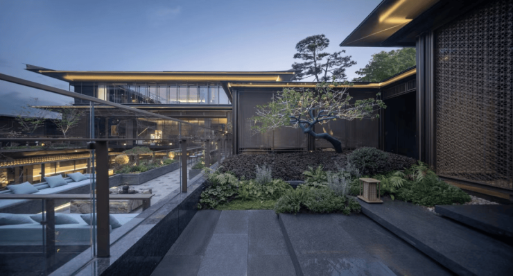 细节雕琢:歇山重檐、纳福悬鱼、黛墨青瓦、瘦金披檐等传统元素与现代材质结合,AKASA万界设计将吴昌硕篆刻美学融入建筑细节。