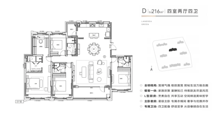 户型产品:主推建面约123㎡至216㎡的精装三至四房,涵盖多种户型,满足不同家庭结构需求,部分户型带双阳台、270°观景视野及主卧套房设计。