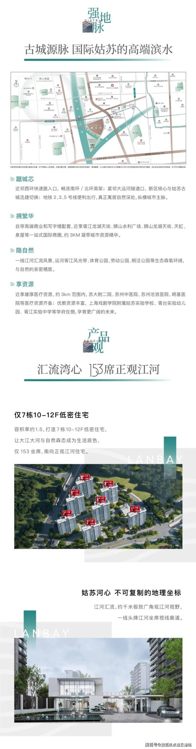 整体规划仅7栋低密建筑,153江河坐席,头牌正观江河,社区打造十数个水畔洄游花园,借江景入园,苏派的婉约与江河的壮阔交辉相映,产品楼栋排布前低(10F)后高(12F),建筑立面采用国际极简风。