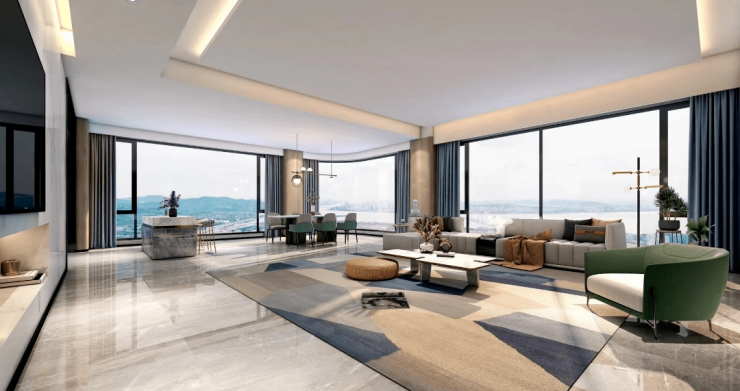 主力户型:建筑面积约324-490㎡,主力为347㎡大平层,包含4+1房或5房设计,主卧面宽达5.8米,采用270°环幕落地窗