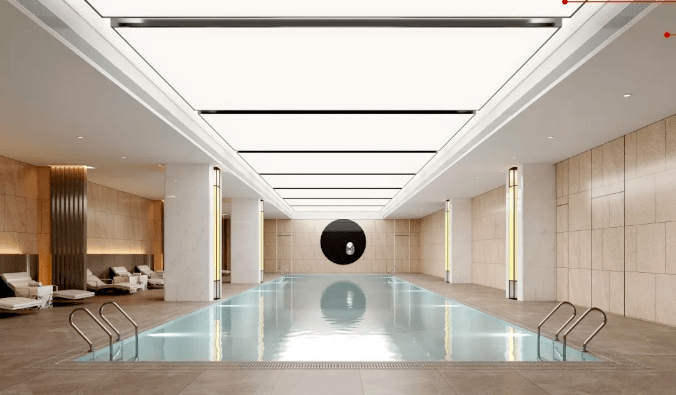 景观规划:打造约10000㎡中央花园,融入《富春山居图》意境,含三进院落、600㎡水景及500米跑道,配套铂金会所(含恒温泳池、室内高尔夫等)