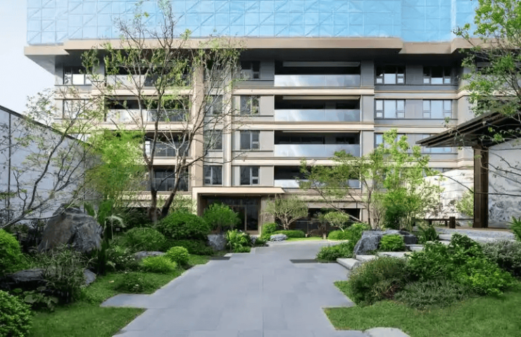 社区园林 :"一轴两院八景"三进制园林,香槟色外立面与大面积玻璃幕墙设计