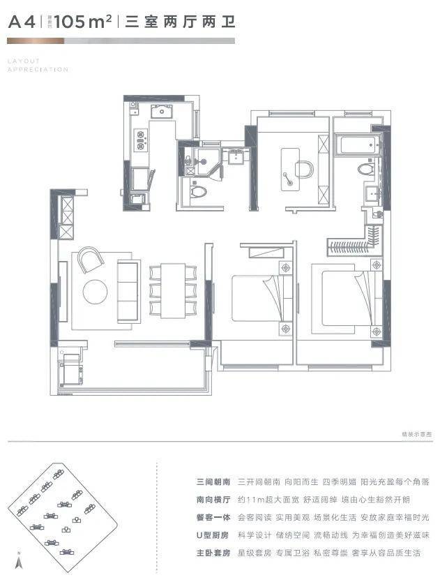 雅乐云庭主力户型包括建面约105㎡、125㎡、135㎡户型,每个户型在尺度和功能空间上都达到了极致。这些户型不仅空间布局合理,而且采光通风俱佳,充分考虑了居住的舒适度和实用性。