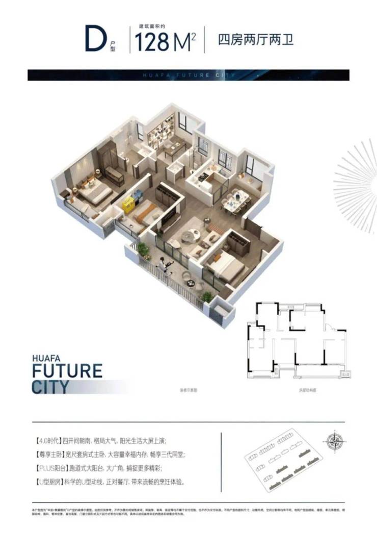128㎡:四居室,四开间朝南,主卧含独立卫浴和衣帽间