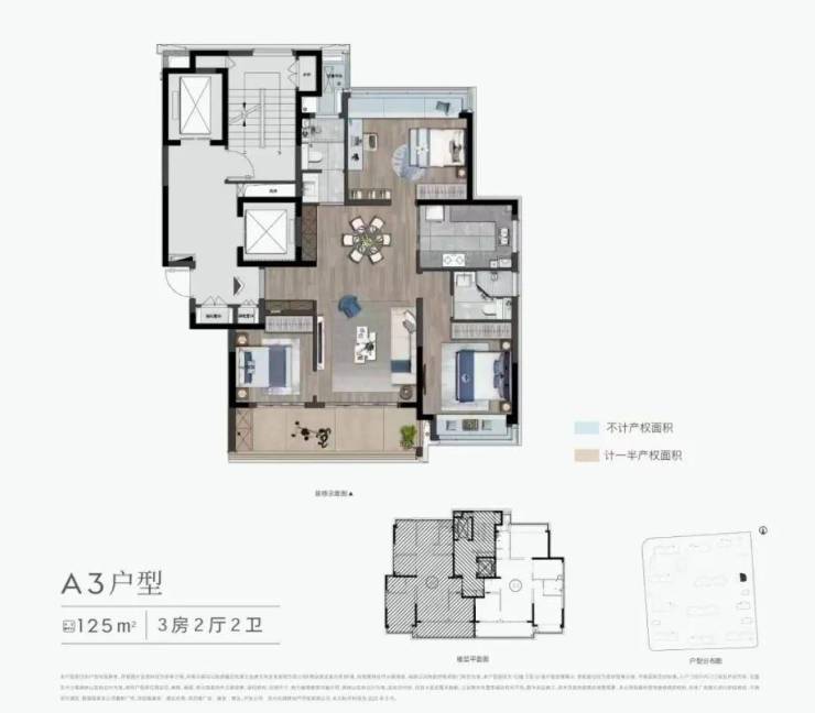 125㎡四房两厅两卫:南北通透,双联阳台设计,得房率约77-80%