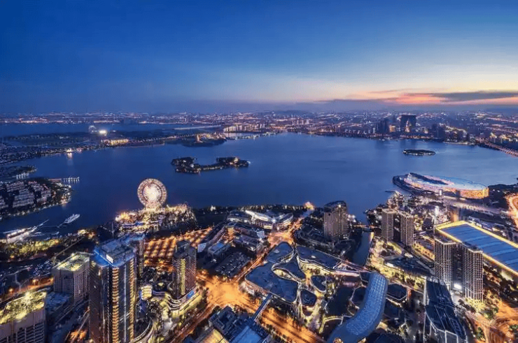 夜景亮点:项目外立面玻璃幕墙与金鸡湖灯光秀同框,夜间视觉冲击力强