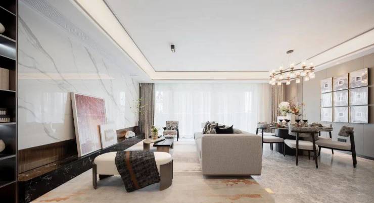 以268平下叠为例,主厅开间宽阔,客厅餐厅连通,大开间朝南,无论是视野还是采光都宽阔通透。