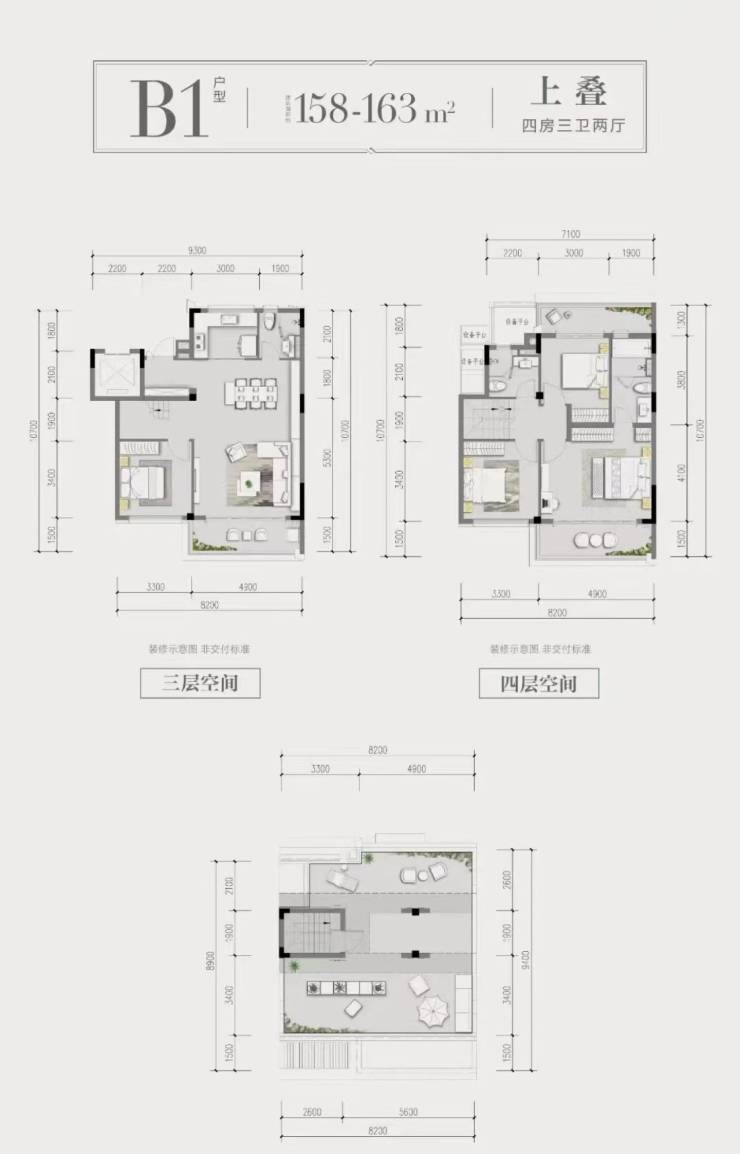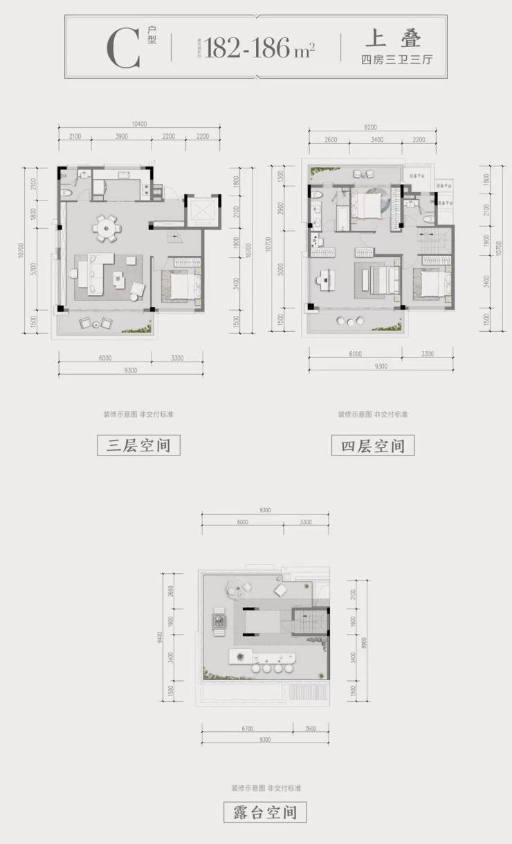 上叠户型:建面约142-186平方米,赠送约70平方米星空露台,套内面积184-241平方米