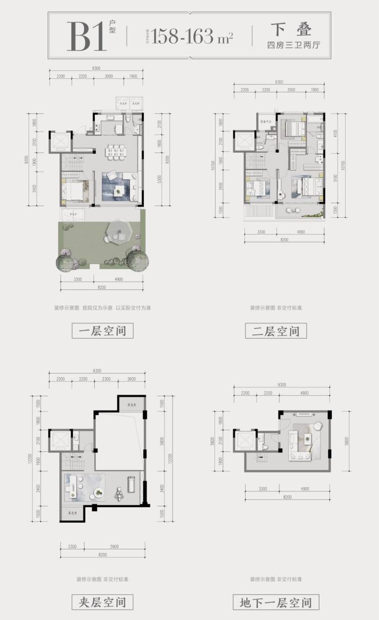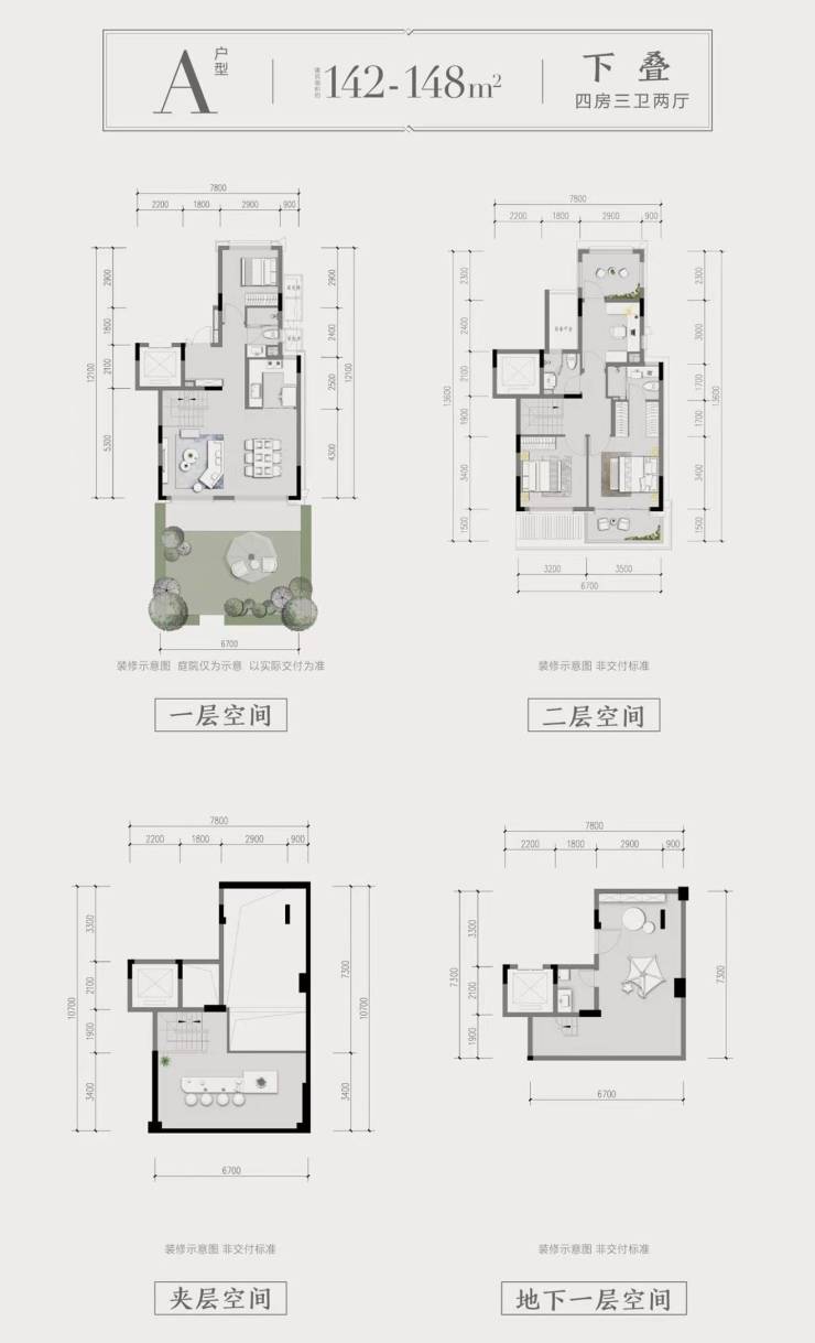 下叠户型:建面约142-186平方米,赠送约50平方米花园和5.4米挑高地下室(双层全赠送),实际使用面积达191-262平方米