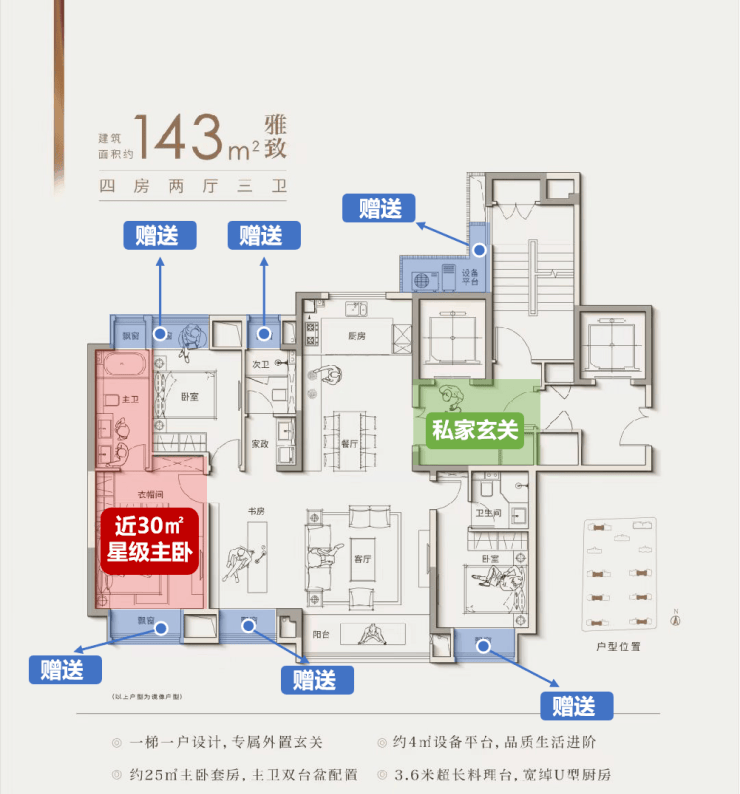 143㎡四居室:四室两厅三卫,主卧套房设计(约25㎡),总价257-257.5万/套
