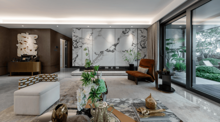 项目携手奥雅设计总监袁恺打造"一轴一核五园"景观体系,以4000㎡中央水景花园为核心,串联"林隐、沐心、潺溪、拾趣、山涧"五大主题园区,植入苏州古典园林造园手法与安缦酒店设计灵感。特色设计包括: