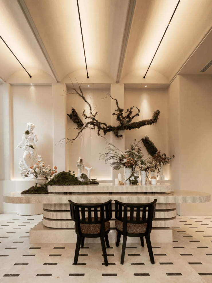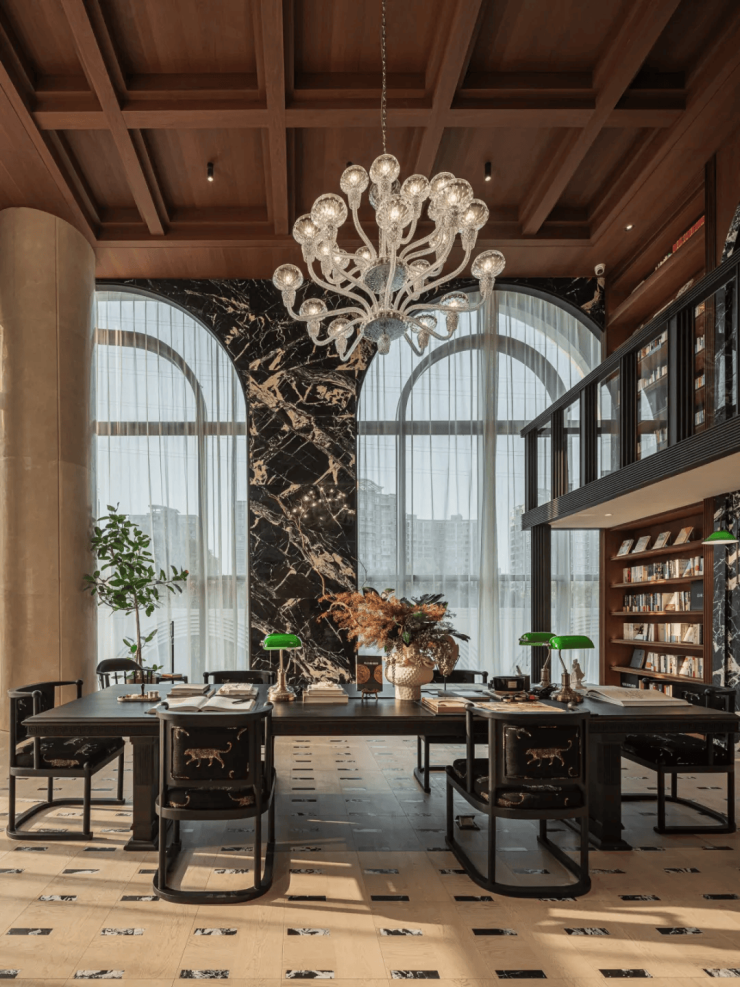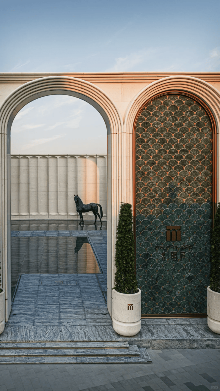 建筑由九米设计操刀,外立面采用铝板、石材、玻璃与金属线条,打造悬浮感与雕塑感兼具的现代建筑。标志性12米通高石材拱券、贝金米黄与宝格丽绿奢石铺装,尽显庄重雅致,被誉为“石材的博物馆” 。